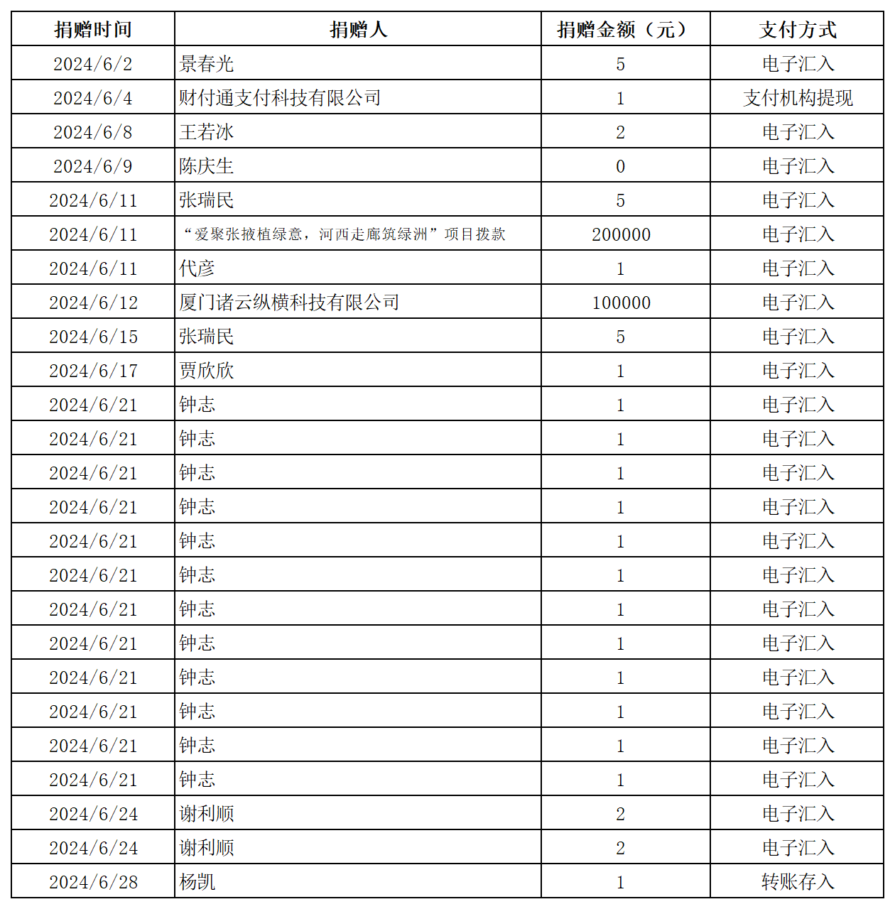 2024年張掖市慈善協(xié)會積極搭建愛心平臺,得到廣大愛心人士和愛心單位積極響應(yīng),踴躍捐款捐物,現(xiàn)將(2024年6月1日--6月30日)接收到的銀行轉(zhuǎn)賬收入公示如下: